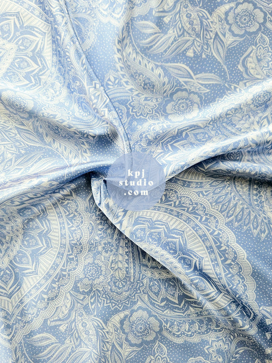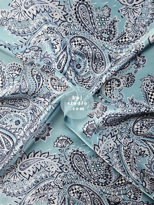 Sky Blue Intricate Paisley Eco Gloss Satin Fabric
