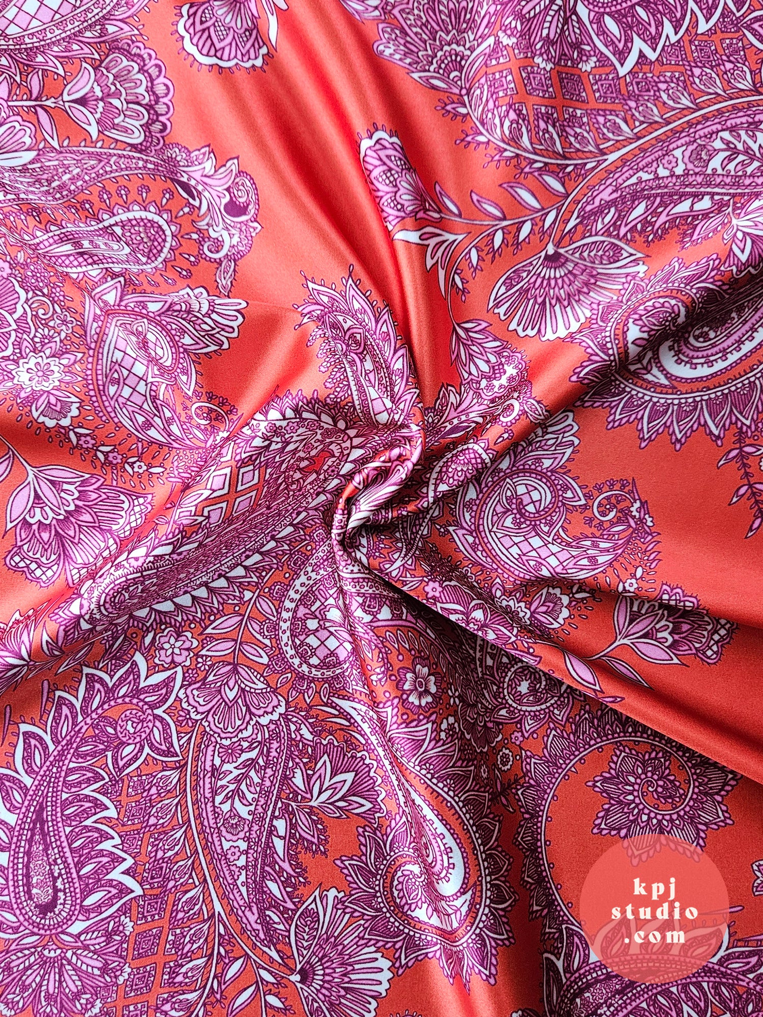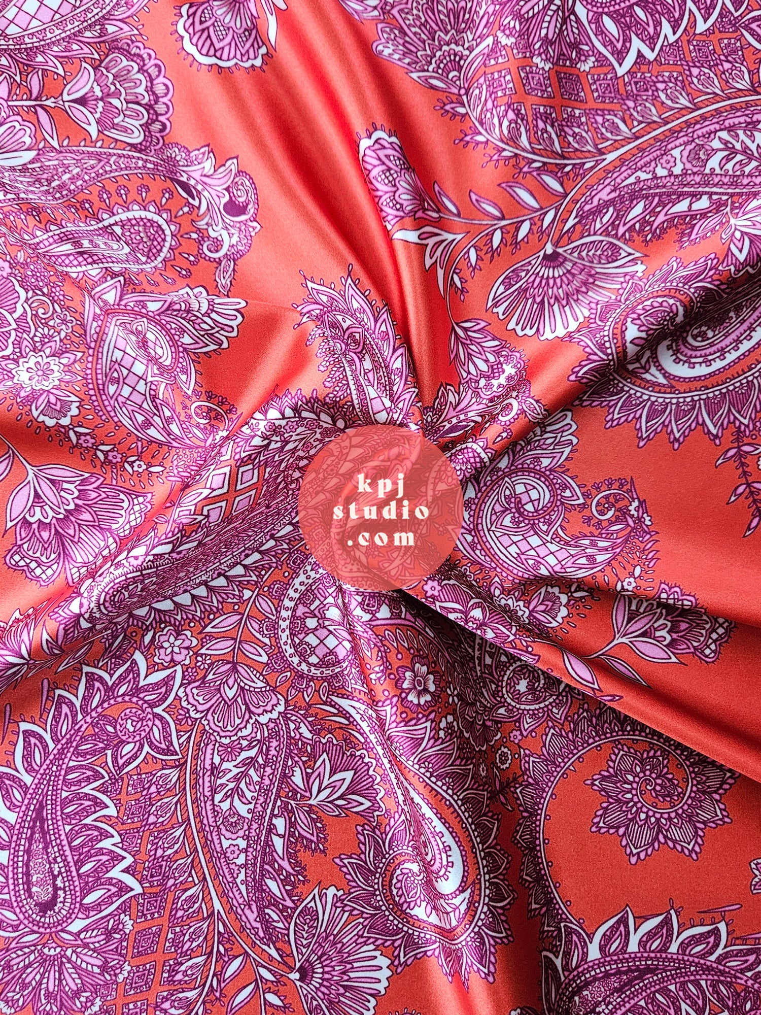 Orange & Pink Intricate Paisley Eco Gloss Satin Fabric.
